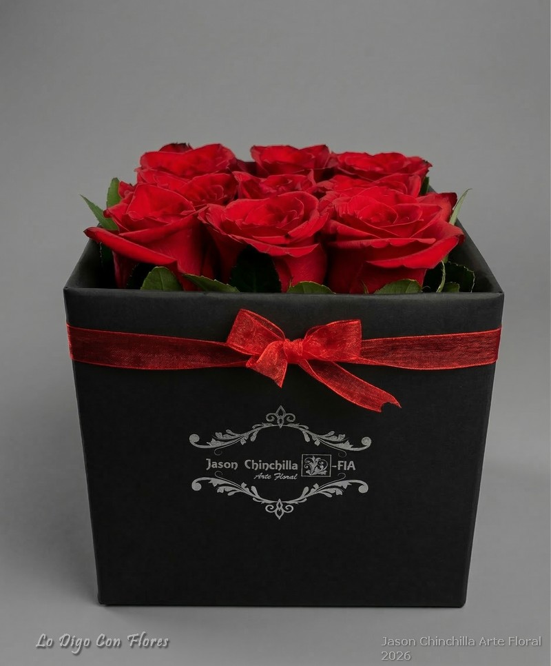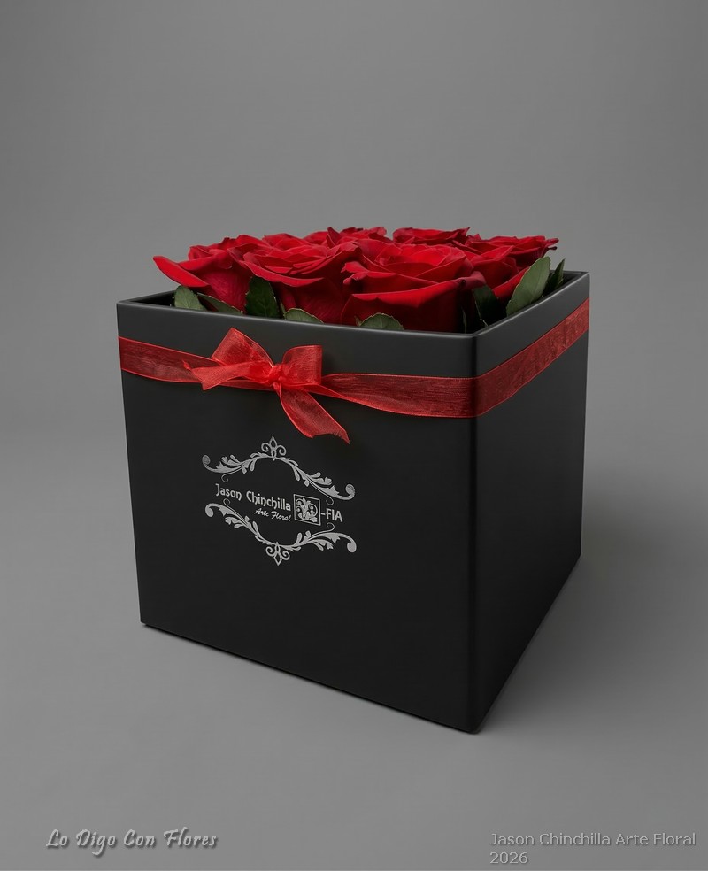 Caja con rosas frescas en su interior salidas al borde, decorada con follajes naturales y flores de complemento, presentada en caja decorativa que aporta una presentación elegante y moderna.