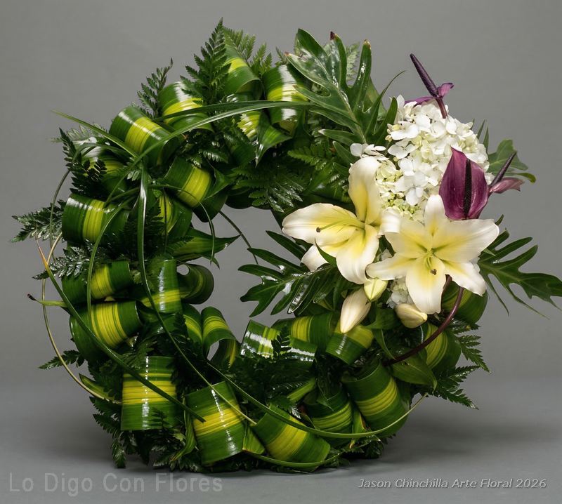 Corona de follajes tipo «corona de laurel» con corsage de flores variadas elaborada con flores frescas y follajes naturales, diseñada para expresar respeto, acompañamiento y condolencia.