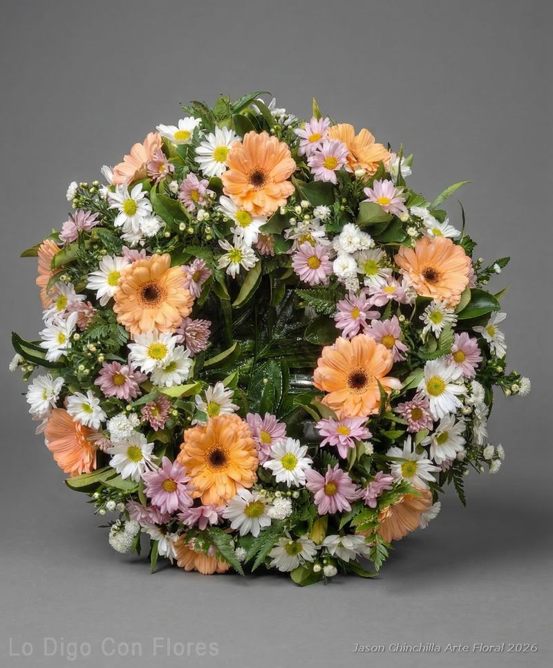 Cada arreglo es preparado por el florista respetando el estilo, tamaño y combinación de colores ofrecidos, procurando una presentación sobria y adecuada para ceremonias de despedida, velas, misas, novenarios y ocasiones similares. Incluye tarjeta de condolencias donde puede indicarse el mensaje que se desea enviar.