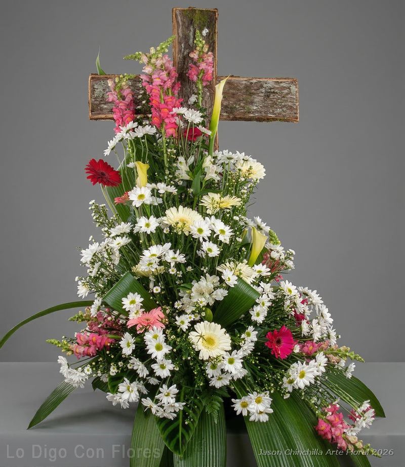 Cruz funebre flores variadas en base de madera con floress frescas y follajes naturales, diseñada para expresar respeto, acompañamiento y condolencia.