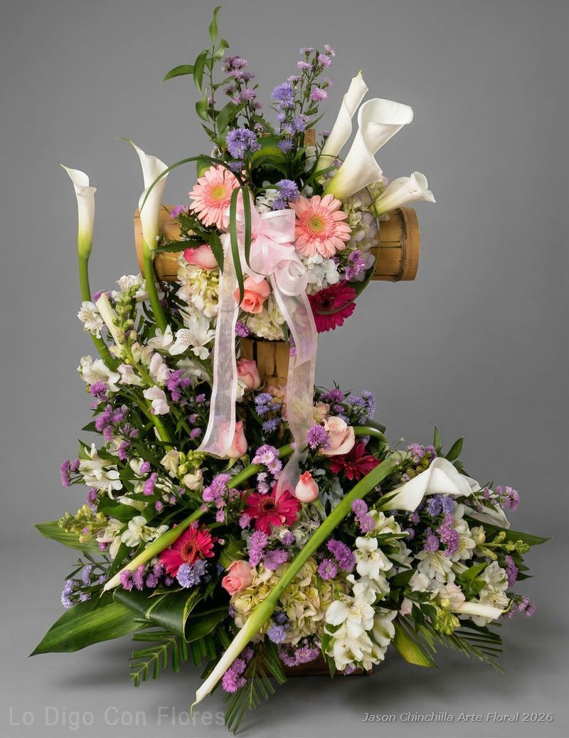 Cada arreglo es preparado por el florista respetando el estilo, tamaño y combinación de colores ofrecidos, procurando una presentación sobria y adecuada para ceremonias de despedida, velas, misas, novenarios y ocasiones similares. Incluye tarjeta de condolencias donde puede indicarse el mensaje que se desea enviar.