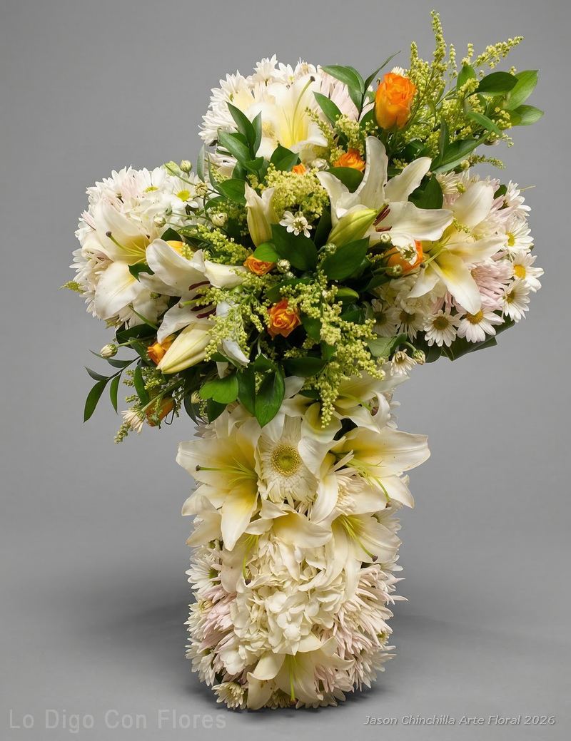 Imágenes con fines ilustrativos para mostrar características generales del producto. El diseño final se realiza con criterio profesional siguiendo la línea del producto seleccionado. En ocasiones muy esporádicas las especies de flores, follajes o algunos tonos pueden variar según disponibilidad de flores frescas y materiales de decoración, procurando siempre una composición equilibrada y acorde con el estilo de la ofrenda. ver Términos y condiciones