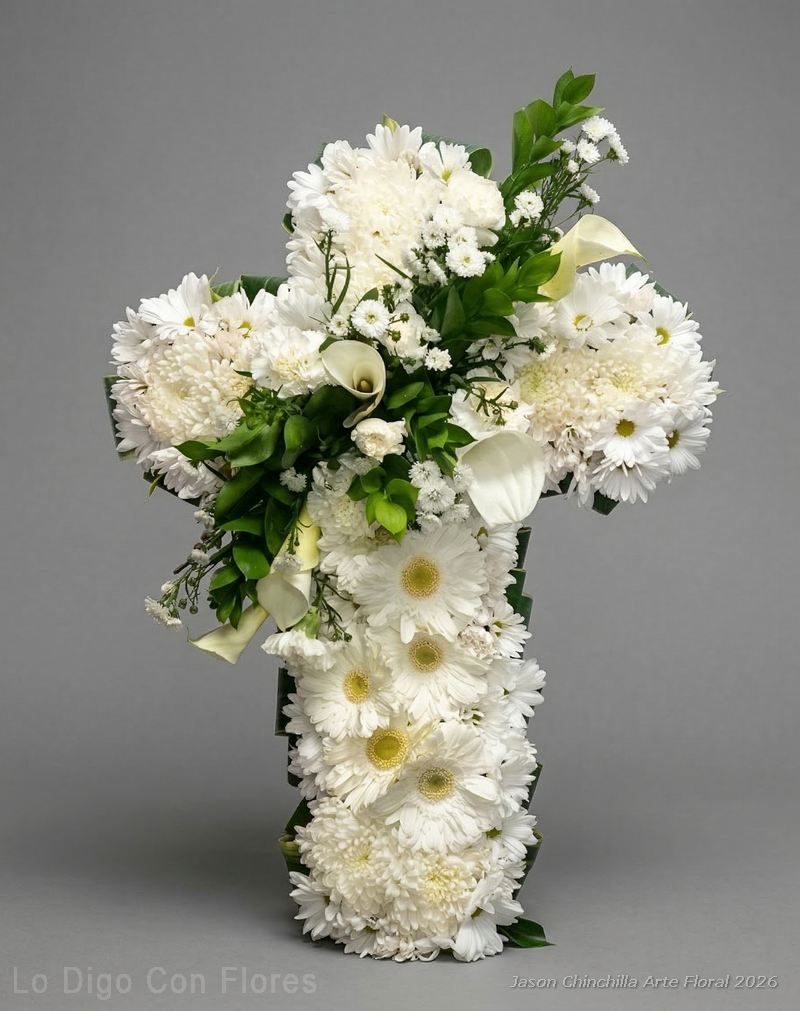 Cruz funebre rellena en flores variadas color a escoger elaborada con flores frescas y follajes naturales, diseñada para expresar respeto, acompañamiento y condolencia.