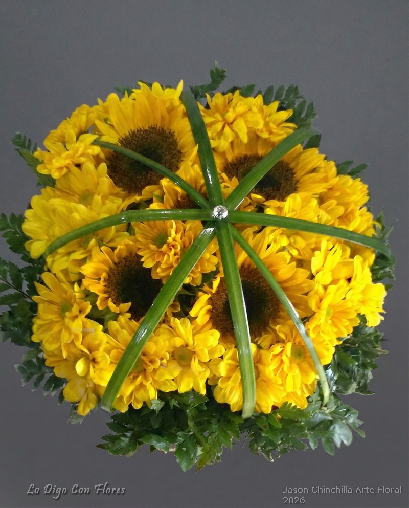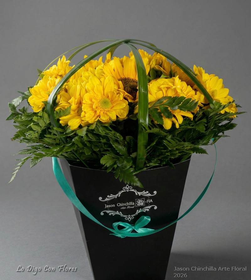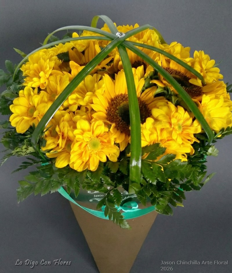 Girasoles en Cono. Elegante cono con girasoles y margaritas amarillas o aster amarillo. Decoracion con follajes especiales