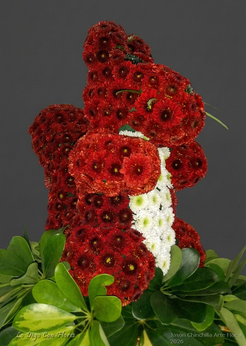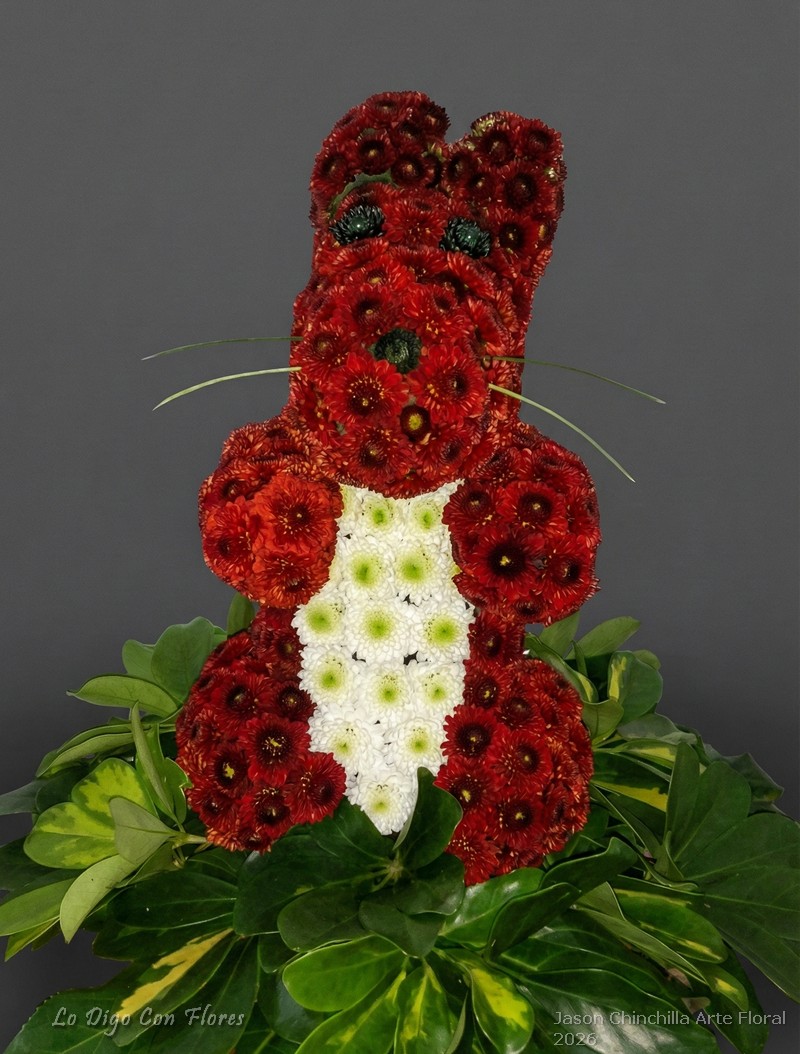 Escultura tridimensional hecha a mano por el diseñador, modelada en espuma floral y cuidadosamente cubierta con flores naturales para crear una figura 3D realista, estética y detallada.