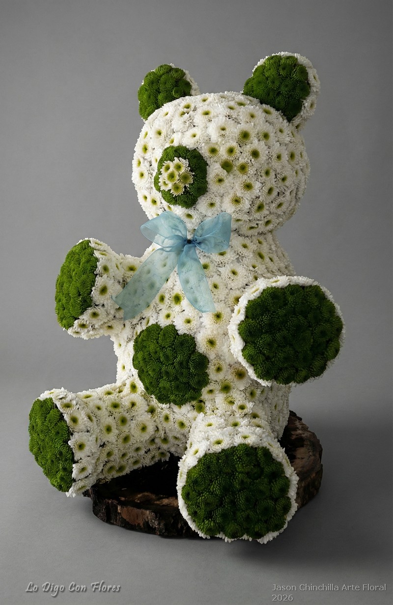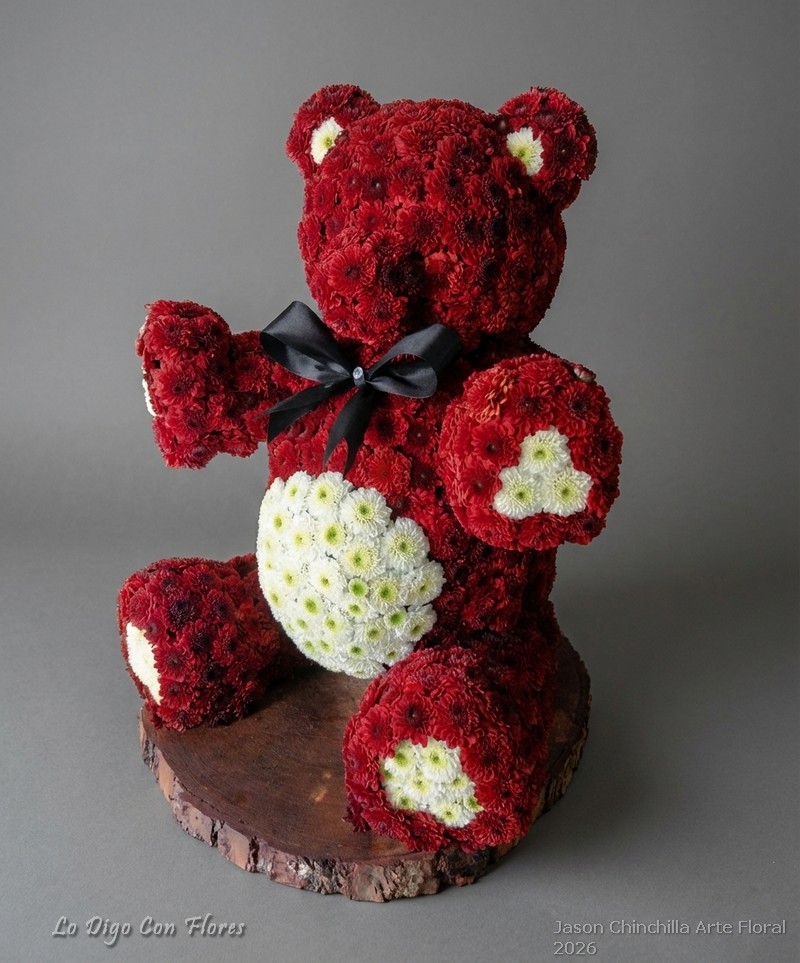 Escultura tridimensional hecha a mano por el diseñador, modelada en espuma floral y cuidadosamente cubierta con flores naturales para crear una figura 3D realista, estética y detallada.