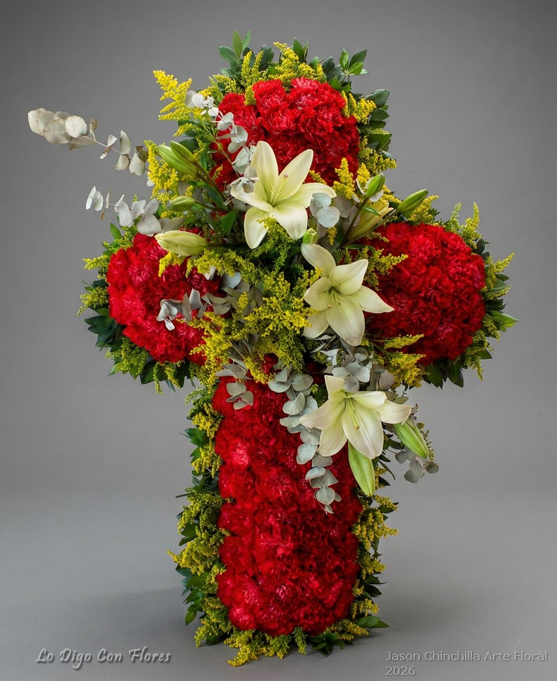 Cruz funebre. Ofrenda fúnebre en forma de cruz rellena de claveles o Crisantemos