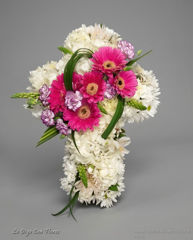 Cruz funebre rellena en base de madera. Ofrenda fúnebre en forma de cruz rellena en base de madera elaborada con flores frescas y follajes naturales, diseñada para expresar respeto, acompañamiento y condolencia. Incluye corsage en el vertice