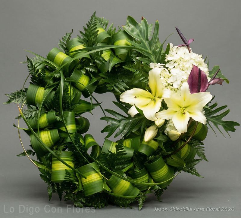Corona de follajes tipo «corona de laurel» con corsage de flores variadas elaborada con flores frescas y follajes naturales, diseñada para expresar respeto, acompañamiento y condolencia.