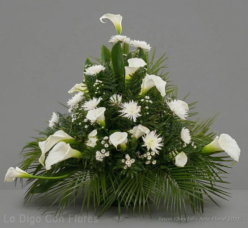 Cada arreglo es preparado por el florista respetando el estilo, tamaño y combinación de colores ofrecidos, procurando una presentación sobria y adecuada para ceremonias de despedida, velas, misas, novenarios y ocasiones similares. Incluye tarjeta de condolencias donde puede indicarse el mensaje que se desea enviar.