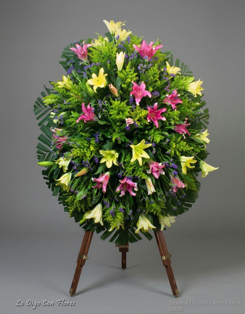 Cada arreglo es preparado por el florista respetando el estilo, tamaño y combinación de colores ofrecidos, procurando una presentación sobria y adecuada para ceremonias de despedida, velas, misas, novenarios y ocasiones similares. Incluye tarjeta de condolencias donde puede indicarse el mensaje que se desea enviar.