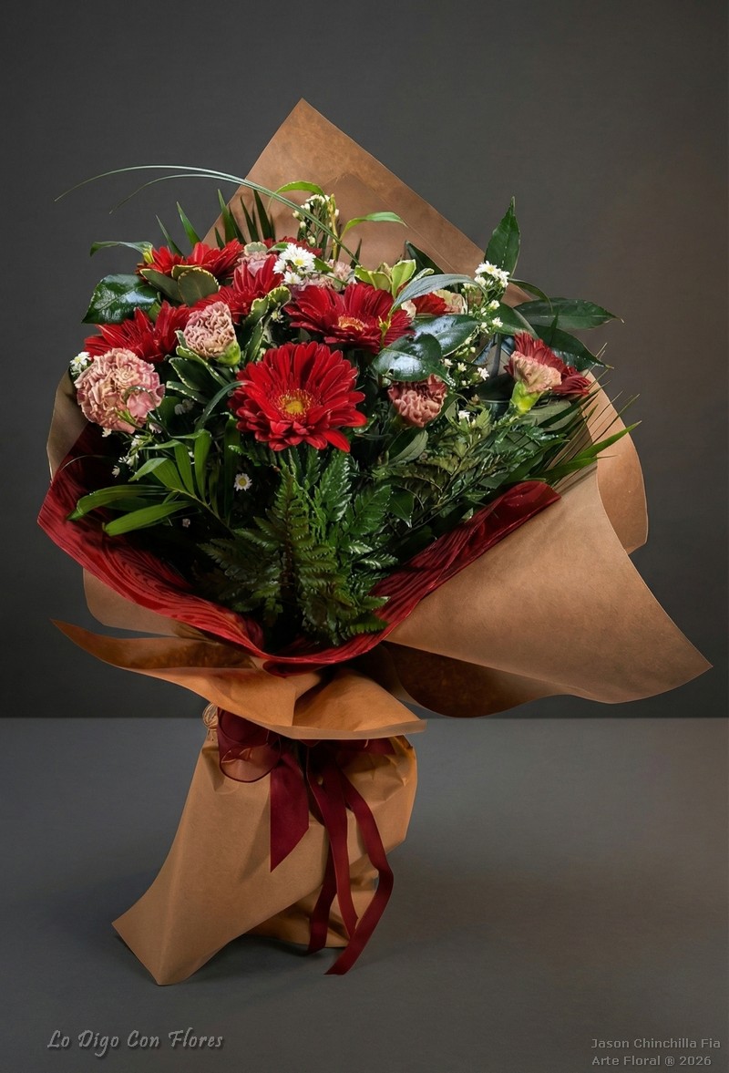 Ramo de gerberas y claveles redondo decorado con follajes especiales y flores de complemento extra. Envuelto en dos tipos de papel diferentes y decorado con lazo.