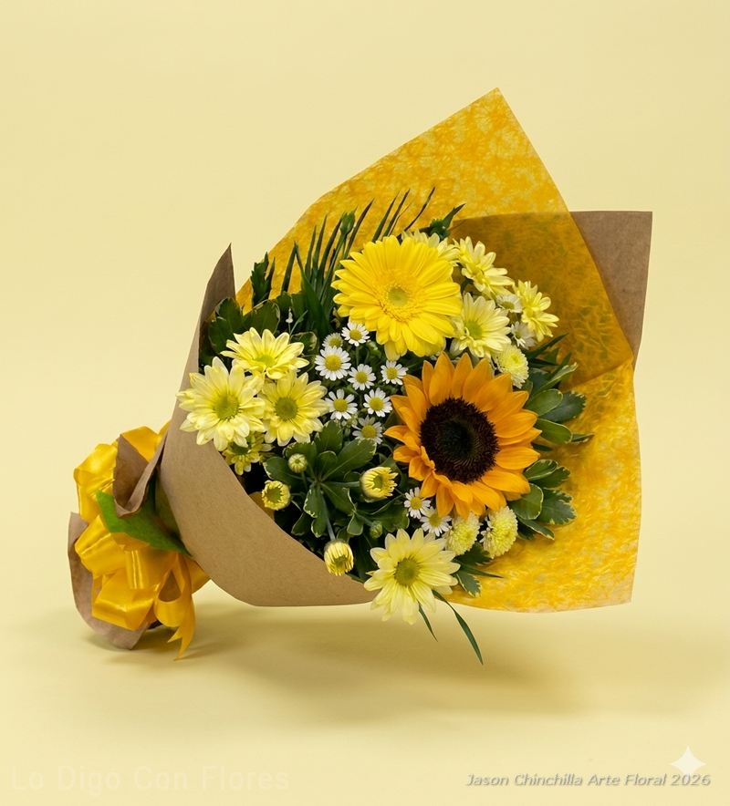Los ramos de flores variadas se preparan con las flores y follajes disponibles en la floristería al momento de su elaboración. Habitualmente pueden incluir gladiolas, girasoles, crisantemos, lirios, gerberas, popis, astromelias, claveles y otras flores de temporada según disponibilidad.