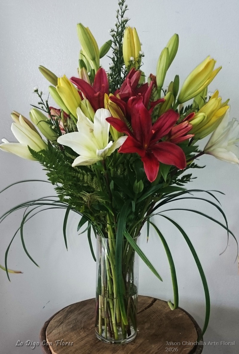 Recibimos flores frescas todos los dias, procuramos colocar los lirios mezclados entre abiertos y cerrados segun disponibilidad.