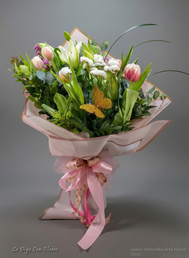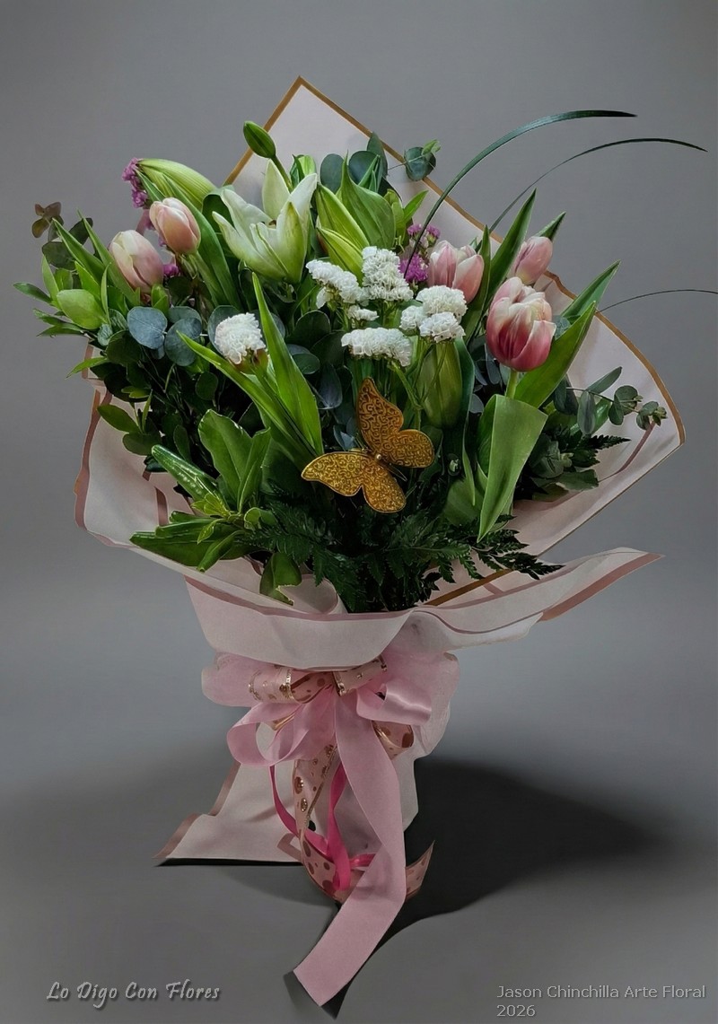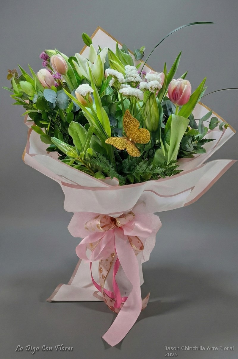 Ramo de tulipanes decorado con follajes especiales y flores de complemento extra. Envuelto en papeles diferentes y decorado con lazo.