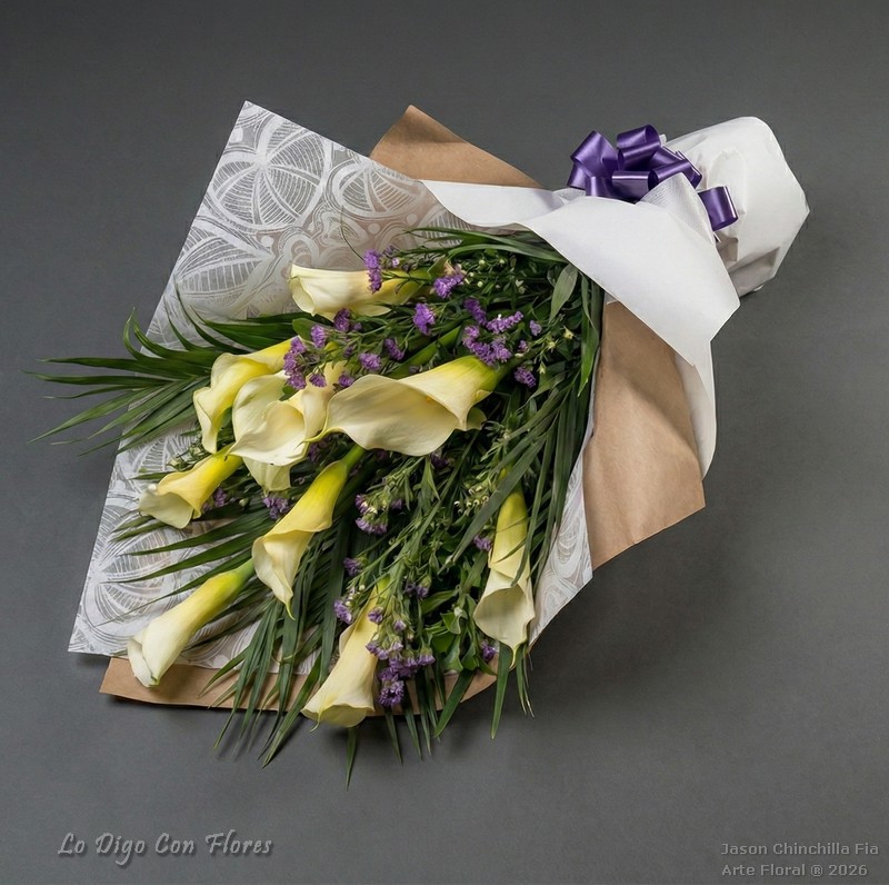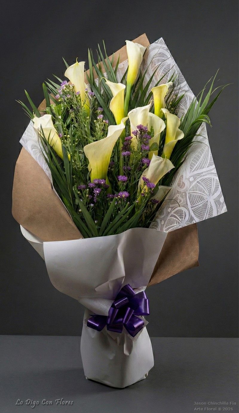 Ramo atado con calas decorado con follajes especiales y flores de complemento. Puede escoger la cantidad de flores a su gusto.