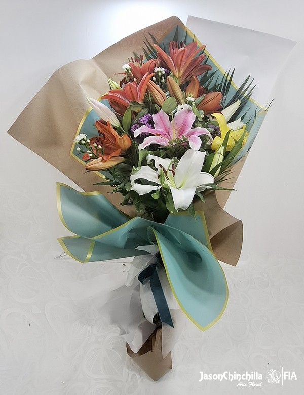 Incluye: 1 docena de lirios (cada tallo trae de 1 a 4 flores) entre cerradas y abiertas, flores de relleno y complemento tipo aster o gypsophilia y follajes varios. Envoltura con papeles craft y papel seda con papel coreano o algodón con lazo decorativo.