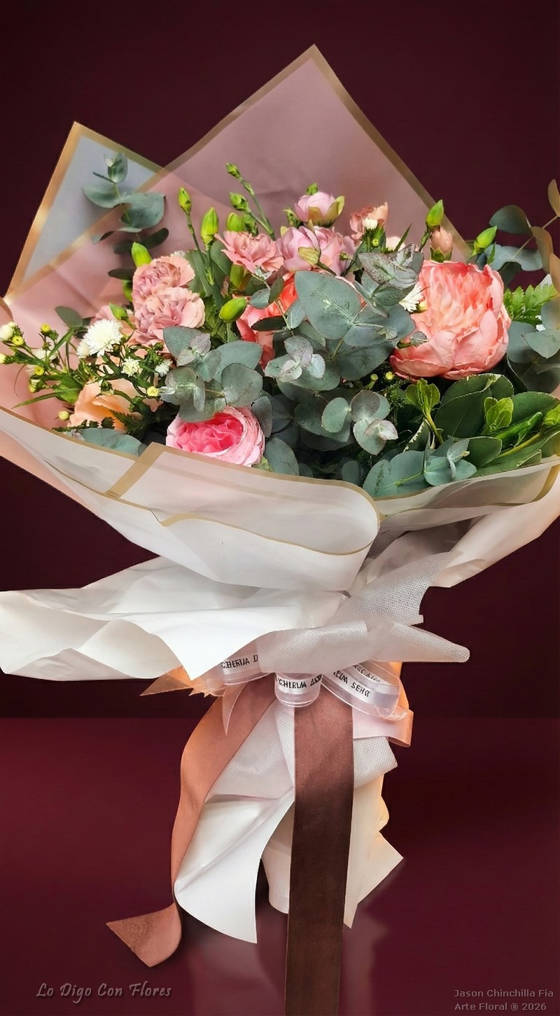 Ramo de peonias en naturaleza permanente envuelto en papel craft, francés o coreano (según color y disponibilidad) con follajes naturales especiales y decoración con papeles y lazo