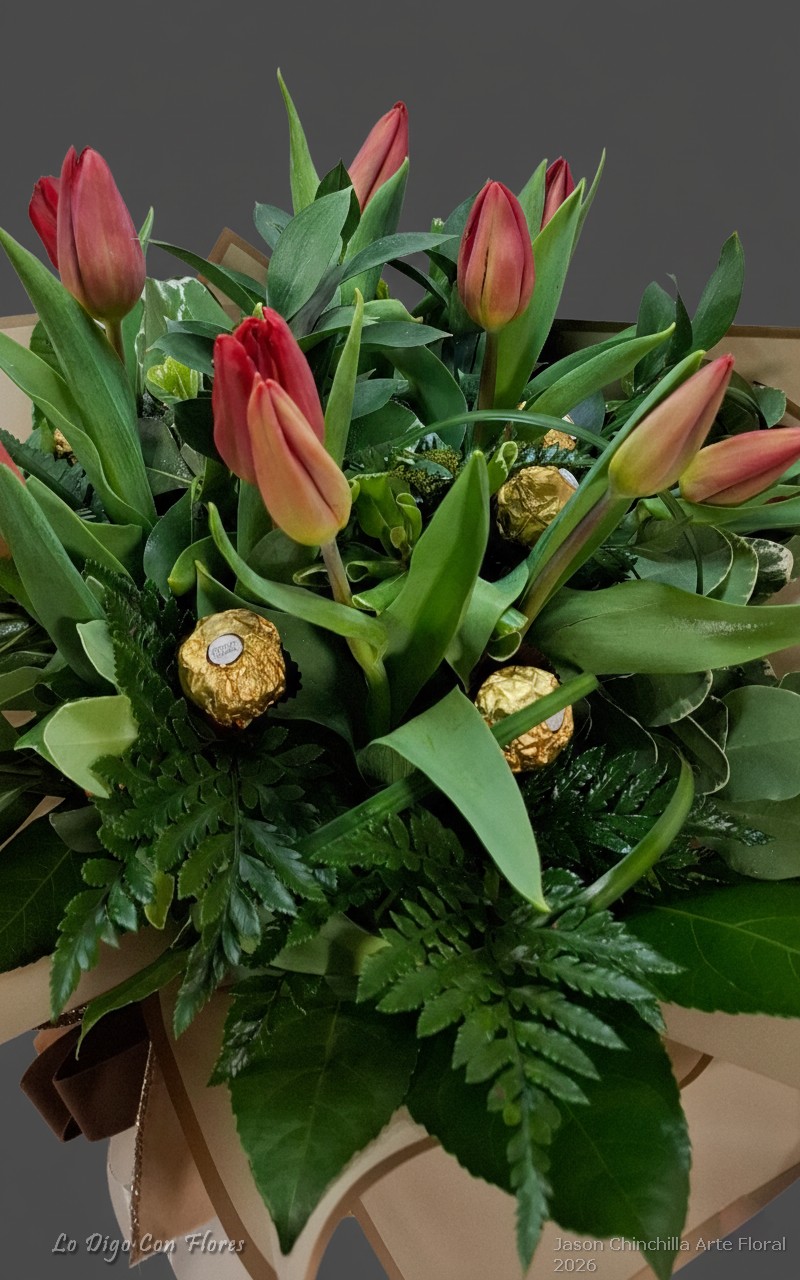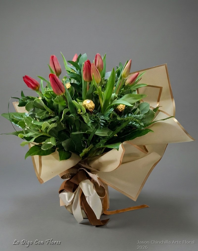 Ramo de tulipanes decorado con follajes especiales y flores de complemento extra. Envuelto en papeles diferentes y decorado con lazo.
