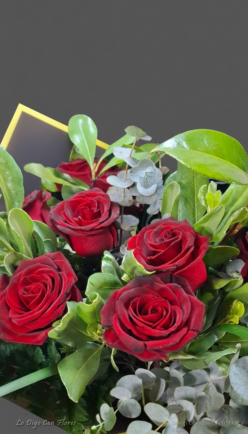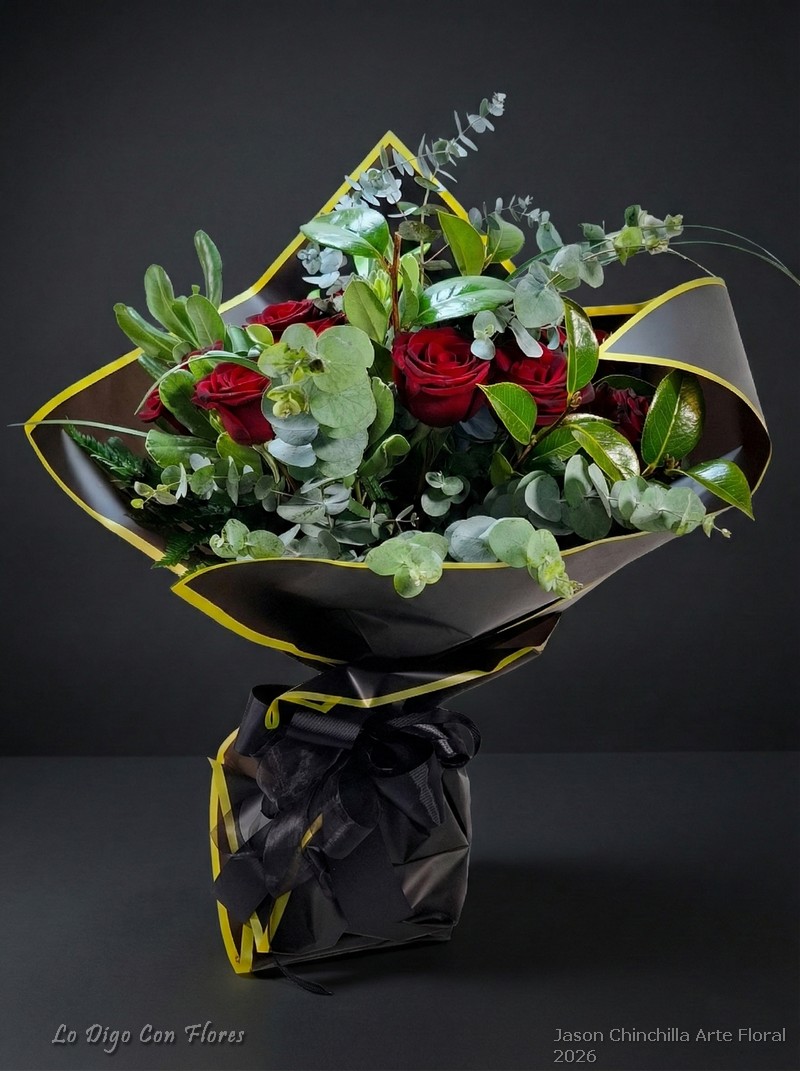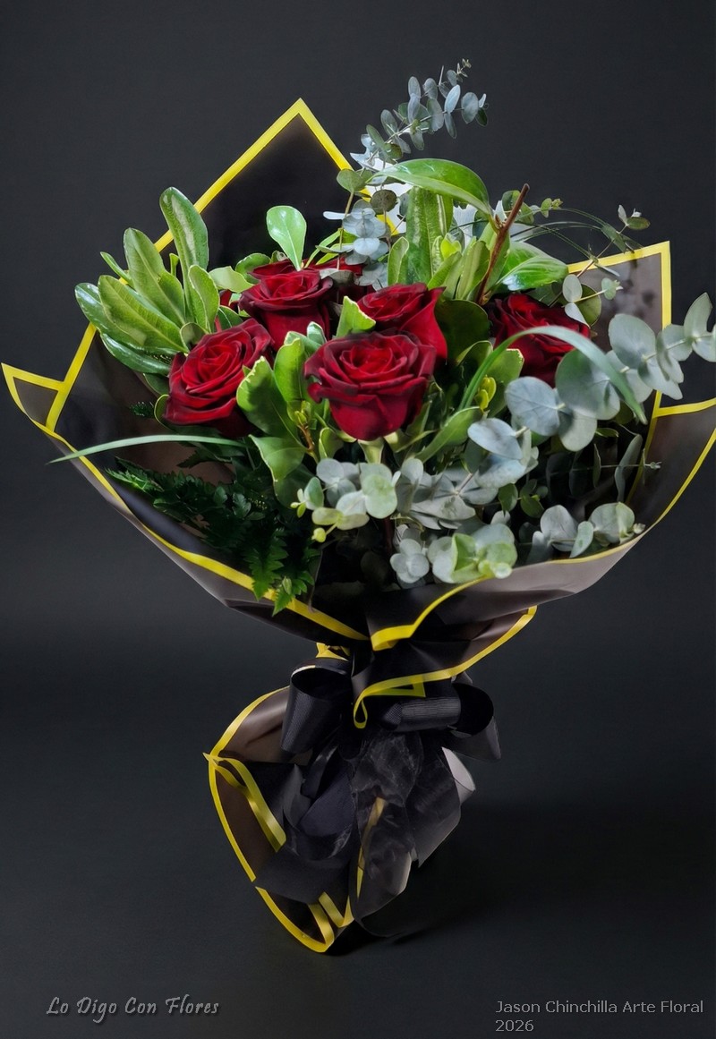 Ramo con rosass decorado con follajes especiales, envuelto en papeles color negro especiales y decorado con lazo y cintas