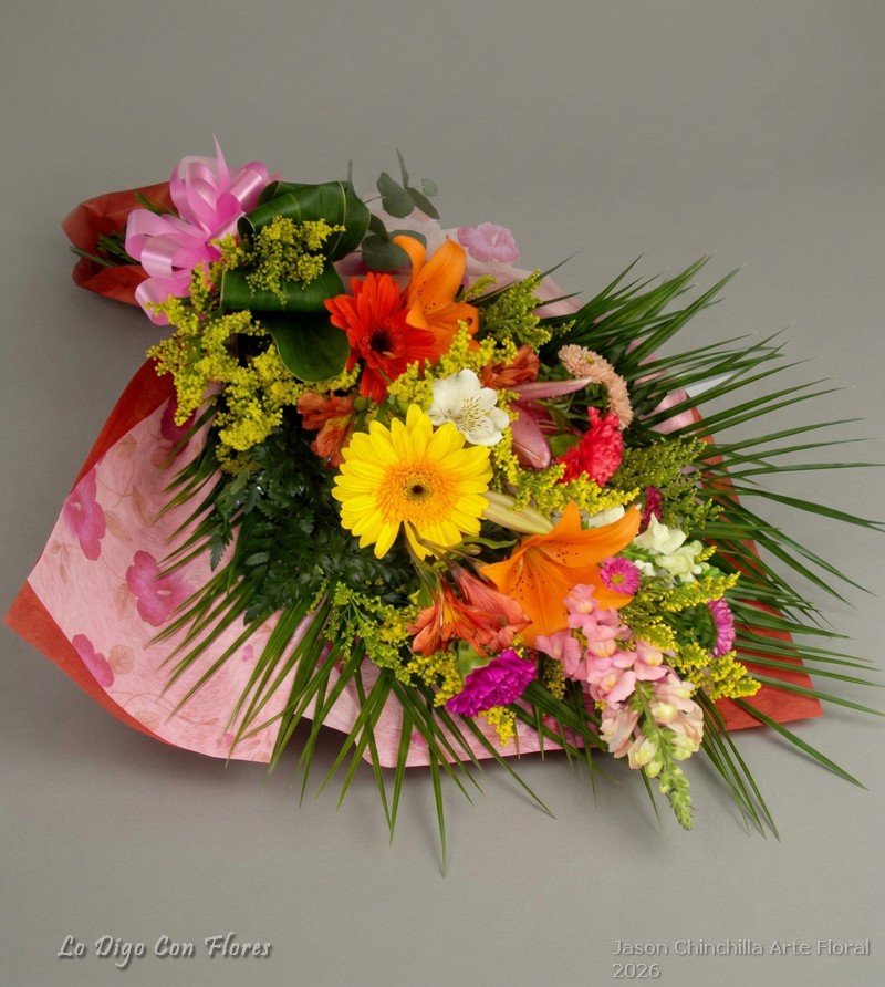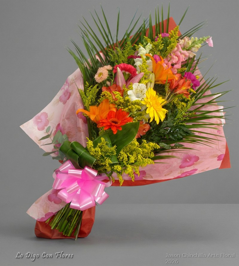 Los ramos de flores variadas se preparan con las flores y follajes disponibles en la floristería al momento de su elaboración. Habitualmente pueden incluir gladiolas, girasoles, crisantemos, lirios, gerberas, popis, astromelias, claveles y otras flores de temporada según disponibilidad.