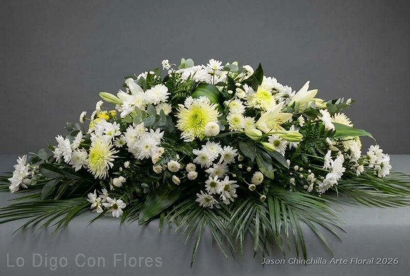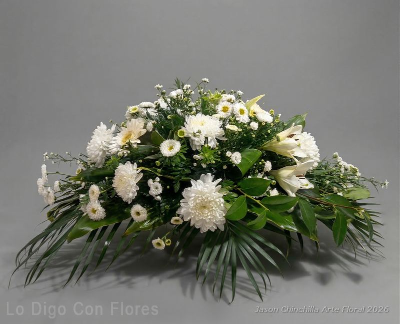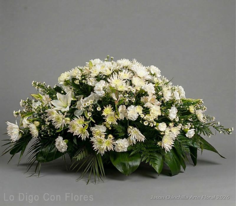 Ofrenda fúnebre tipo tributo con flores variadas color blanco elaborada con flores frescas y follajes naturales, diseñada para expresar respeto, acompañamiento y condolencia.